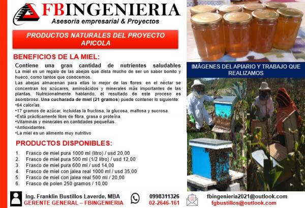 Los productos apícolas primarios más conocidos son la miel y la cera, pero el polen, el propóleos, la jalea real, el veneno de abejas, las abejas reinas, las abejas y sus larvas también son productos apícolas primarios comercializables. La mayoría de ellos se pueden consumir tal y como son producidos por las abejas. Los productos apícolas también pueden utilizarse como ingredientes de otro producto. Debido a la calidad y a la reputación y características casi místicas de los productos apícolas, su inclusión en otros productos secundarios suele realzar su valor o calidad. Esto puede incrementar la rentabilidad de muchas actividades apícolas. Los principales productos apícolas para uso y consumo humano son: Miel - Las abejas melíferas extraen el néctar de las flores y lo almacenan en su buche. Cuando una abeja regresa a la colonia, otra abeja coge el néctar y lo esparce sobre el panal de cera para ayudar a que el agua se evapore. La segunda abeja añade también una enzima llamada invertasa que facilita la descomposición de las moléculas de azúcar. Una vez que el néctar espesa, se sella en una celda con un tapón de cera. Polen - Los granos de polen son pequeñas unidades reproductoras masculinas (gametofitos) formadas en las anteras de las plantas más altas con flores. Propóleos - El propóleos, o “cola de abeja”, es una mezcla de cera de abeja y resinas recolectada en hojas y ramitas. Se utiliza para alinear las cavidades de anidamiento y los panales de cría, sellar las grietas y reducir el tamaño de la entrada a la colmena. El propóleos tiene propiedades antibacterianas y antifúngicas. Jalea real - La jalea real es una sustancia rica en proteínas que alimenta a las larvas. La larva que se convertirá en abeja reina recibe más jalea real, creciendo así más que las otras abejas. Está hecha de polen digerido y miel y contiene azúcares, grasas, aminoácidos, vitaminas, minerales y proteínas. Veneno - El veneno de la picadura de abeja (apitoxina) contiene una mezcla compleja de proteínas. Estudios recientes sugieren que el veneno puede ser beneficioso para los seres humanos.